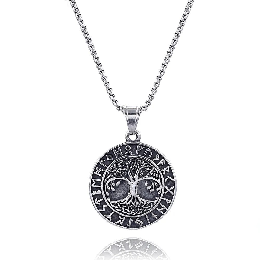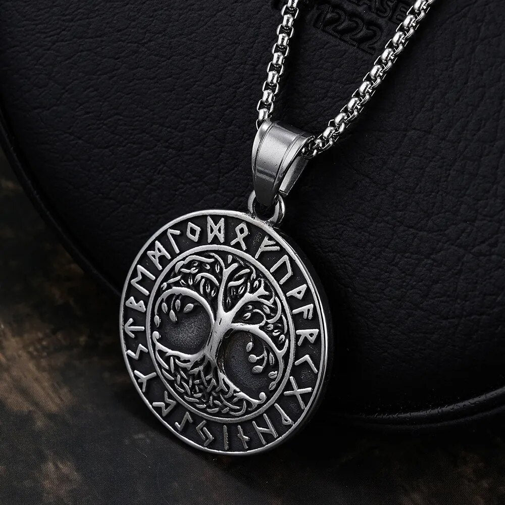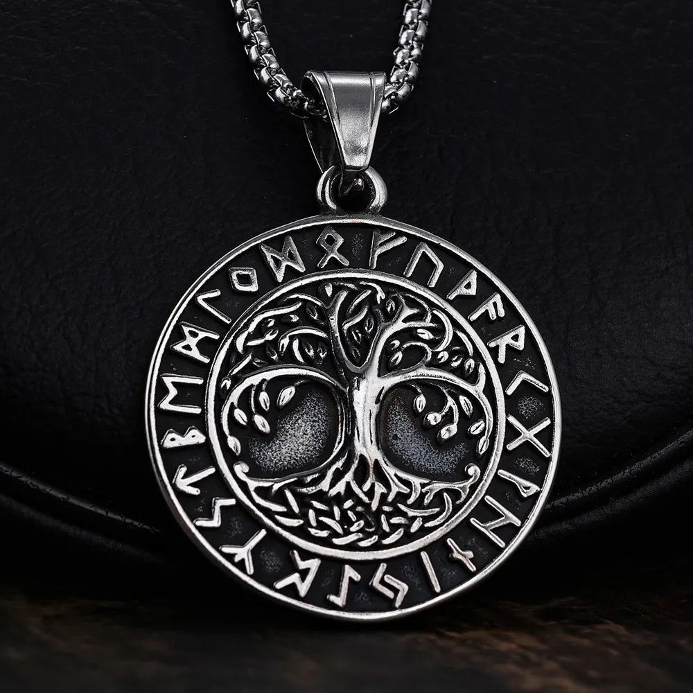 This disk pendant depicts Yggdrasil, the World-Tree, surrounded by the viking rune alphabet.